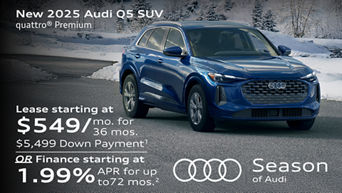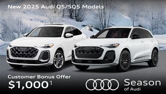 Audi of America will pay a $1,000 Season of Audi Customer Bonus when you purchase or lease a new, unused 2025 Audi Q5/SQ5 quattro through participating dealers through 12/01/2025. Customer bonus applied toward purchase or lease and is not redeemable for cash. Offer not valid in Puerto Rico. See your local Audi dealer or, for general product information, call 1-800-FOR-AUDI. © 2025 Audi of America, Inc.