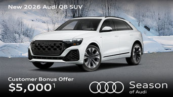 Audi of America will pay a $5,000 Season of Audi Customer Bonus when you purchase or lease a new, unused 2025 and 2026 Audi Q8 55 TFSI quattro through participating dealers through 12/01/2025. Customer bonus applied toward purchase or lease and is not redeemable for cash. Offer not valid in Puerto Rico. See your local Audi dealer or, for general product information, call 1-800-FOR-AUDI. © 2025 Audi of America, Inc.